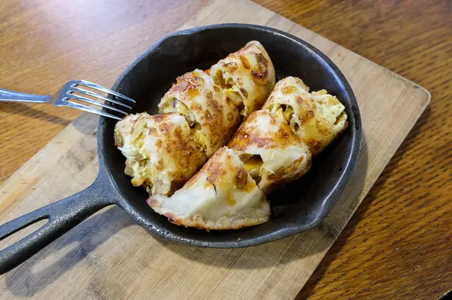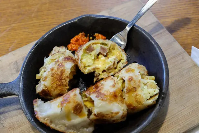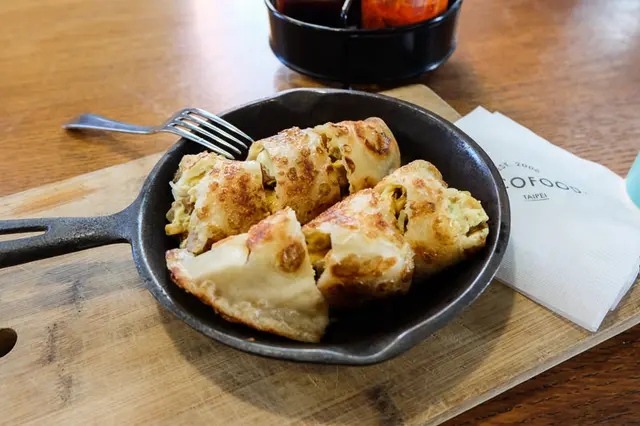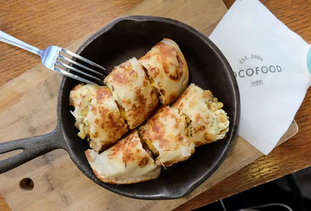 沾上一點辣醬或是調味醬會更加出色,裡面包的應該是起司、玉米、蛋與一些配料,不得不說,又小又貴,但真的美味。姊就是一個只要食物好吃我就可以原諒價格的人。