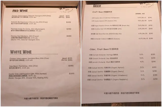 接下來就是酒單時間啦! 跑不掉的紅白酒,以及多款的精釀啤酒、水果啤酒的部分,都有註明%數以及產地。