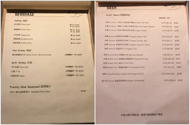 如果不愛喝啤酒的朋友也有鮮榨果汁、咖啡、冷熱飲可以點。