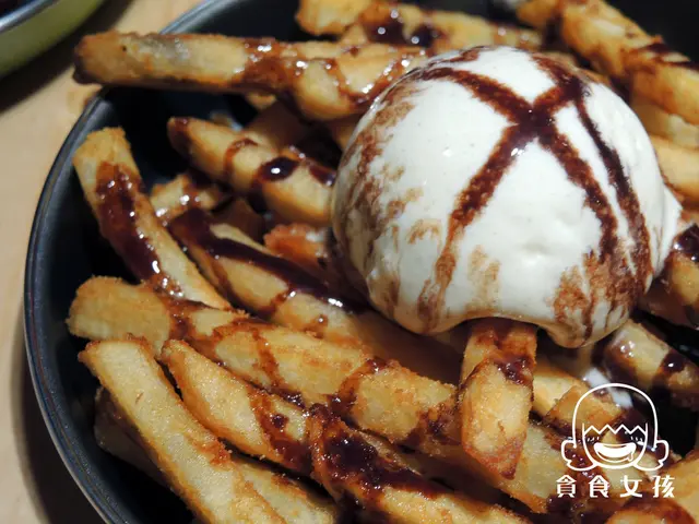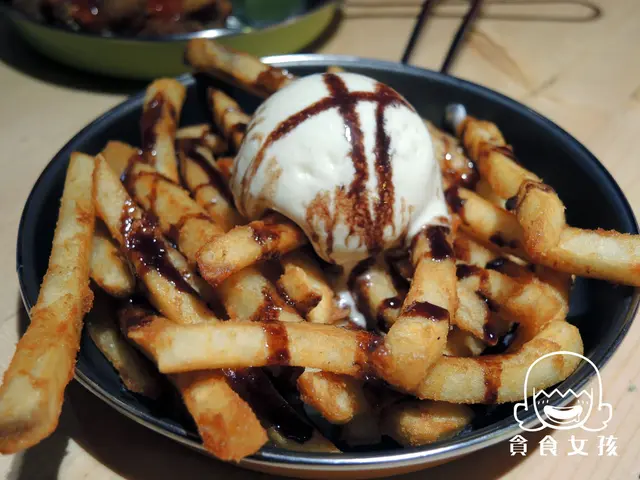 熱熱薯條沾上冰淇淋,冰熱口感交替,搭配著巧克力醬。