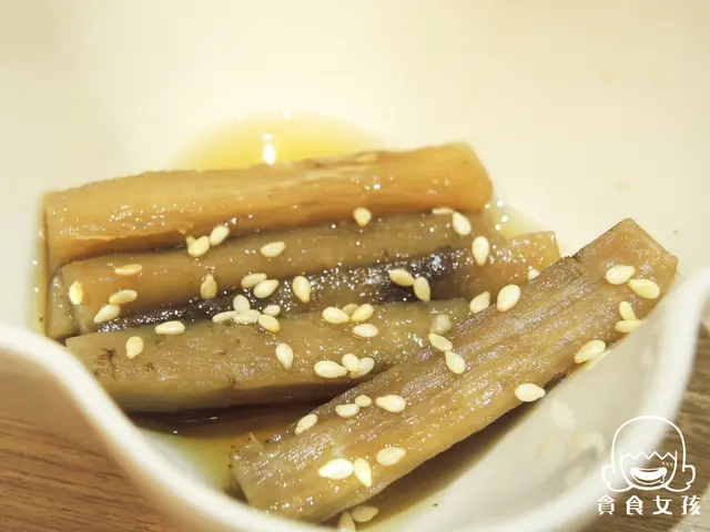 玄麻招待小菜,醃漬過的牛蒡吃起來微甜爽脆,表現不錯!