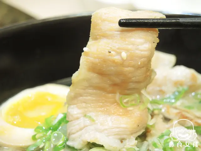 上頭配料有松阪豬肉片、糖心蛋、海苔、蔥花。
