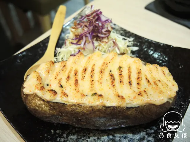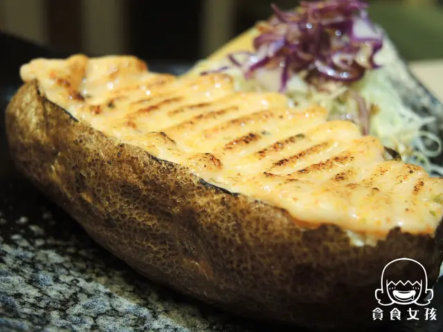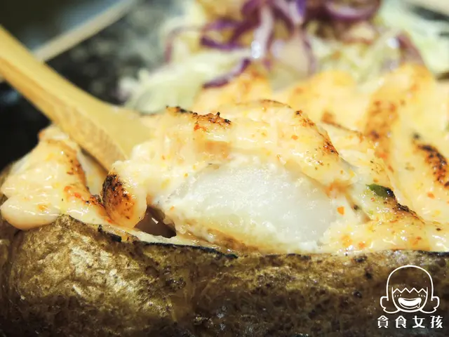 半顆大顆馬鈴薯,最上頭鋪上滿滿明太子醬料,最上層微微炙燒,讓明太子香氣更顯著。