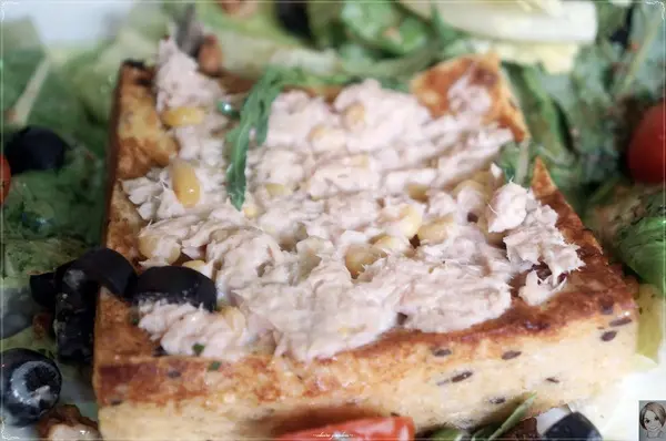 交疊的三層堆疊成塔三層依序是水波蛋、火腿、鮪魚玉米