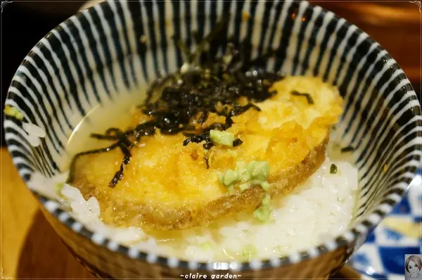 將天婦羅飯入白飯上加入海苔、芥末淋上高湯後就完成了