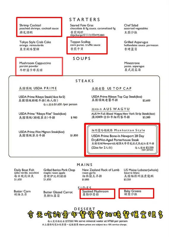 同樣的牛排,午餐硬是比晚餐少了至少500元喔!! 差異就是在前菜跟配菜的不同而已