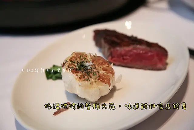 牛排旁邊還有一顆烘烤過的整顆大蒜,其實已經一點大蒜味都沒有了
