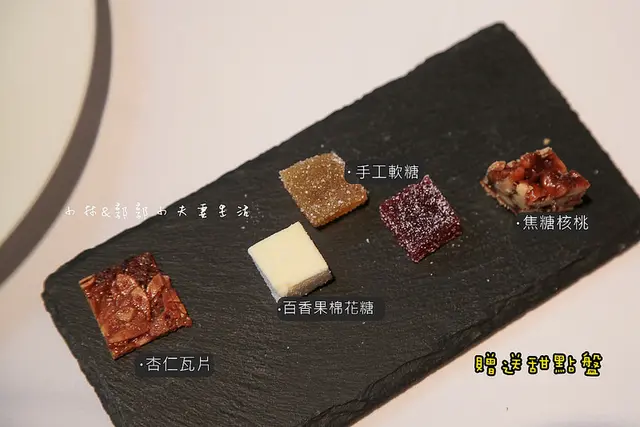 有杏仁瓦片、百香果棉花糖、鳳梨軟糖、莓果軟糖跟焦糖核桃