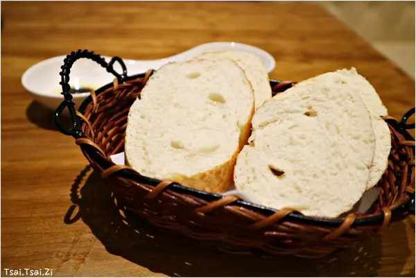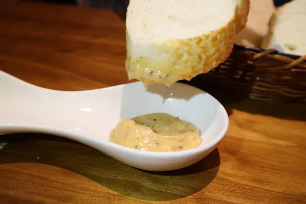餐前麵包上的是德夫起司軟法麵包,里拉義大利廚房提供了兩種醬料沾取,