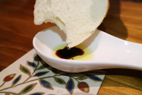 分別是橄欖油醋醬芥末籽醬,兩種醬帶出的風味不一樣,都可以沾看看喔!