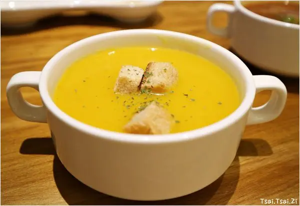 南瓜濃湯喝起來相當綿密,上頭放了幾個吐司丁裝飾,