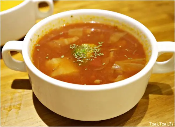 今日的主廚特湯是番茄蔬菜湯,店員說主廚特湯大約兩到三周會更換一次
