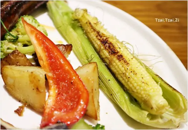 戰斧豬排下方墊了許多馬鈴薯塊和蔬菜,還有一整支還帶皮的玉米筍。