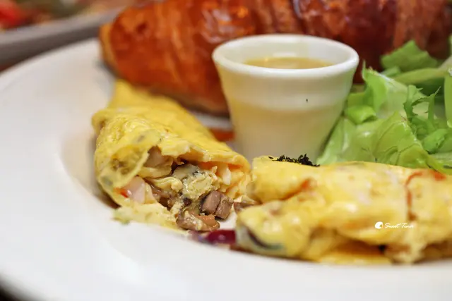 蛋捲裡加入了些許的洋蔥、蕃茄和蘑菇,在口中香氣十足。