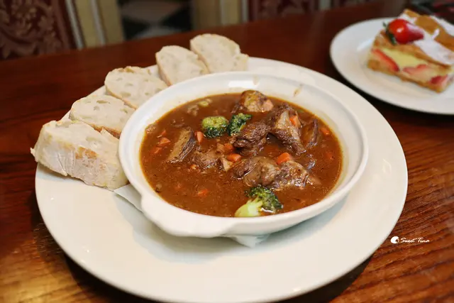 紅酒燉牛肉的食材有牛肋條、馬鈴薯、青花菜、洋蔥、紅蘿蔔,酒香味調配得恰到好處,醬汁也因為蔬菜多了幾分甜味,而且牛肋條燉得好軟嫰喔,即使年長者也不怕咬不動,風味相當棒。