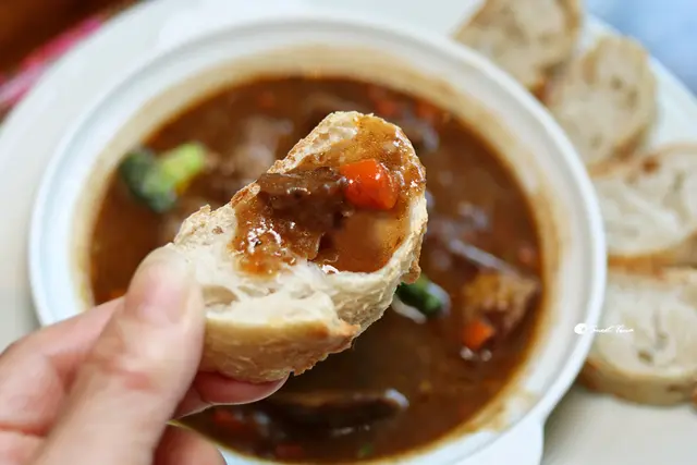 這道餐點可以選擇搭配麵包或是飯,我很喜歡搭配麵包的法式風味,沾上醬汁的法國麵包真的相當迷人。