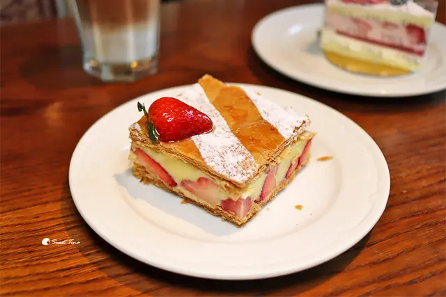 這道甜點可說是店內的不敗經典款,外帶或內用都很受歡迎,香酥的派皮夾上草莓和卡士達醬,完全就是無法抗拒的組合,不過中間的卡士達醬甜度較高一點,建議和派皮一同品嚐,口感會較契合。