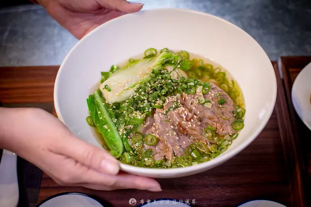 這碗花椒清燉牛肉麵真的很強,先用牛大骨與牛腱心塊去熬煮成的清湯,再加上新鮮的花椒,一上桌就能聞得到那個帶有麻香的清新感,湯頭一入口就像是著了魔似的,很清新很甘甜,後韻跟上來的麻香,辣度還好,就一抹而過,第一口之後馬上很像再喝一口,真的很棒,配菜的部份用的山蘇及高山娃娃菜,也是很特別。