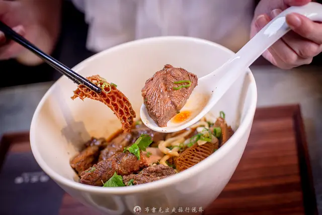 極致三寶牛肉麵是牛肉麵嘉年華限定版,用牛頰、牛腩以及牛肚三種不同的部位,牛肚滷得很透,吃起來很Q彈,口感跟味道都很極致,牛頰算是牛肉中比較夢幻的部位,帶有嚼勁,咬起來口感很好但不會太乾硬,也是相當好吃。