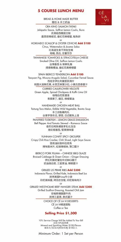 五道式午間套餐1300元,部分是加價升級的選項(水資另計)、加收一成服務費