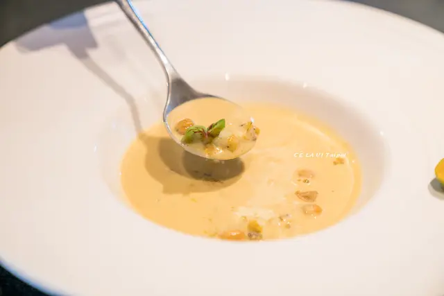 咖哩白花菜濃湯,青蘋果丁、雞豆、檸檬葉油