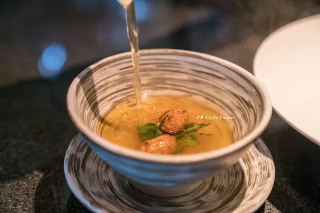 台東芋頭冬瓜、野菜、日式鰹魚上湯,看似澄澈實則有著野菜的甜味與日式鰹魚的韻味