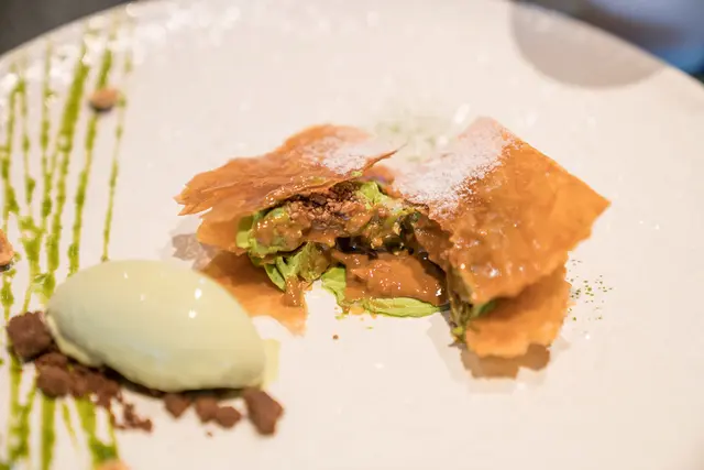 以手工千層派皮擠入小山園抹茶佐綠紫蘇