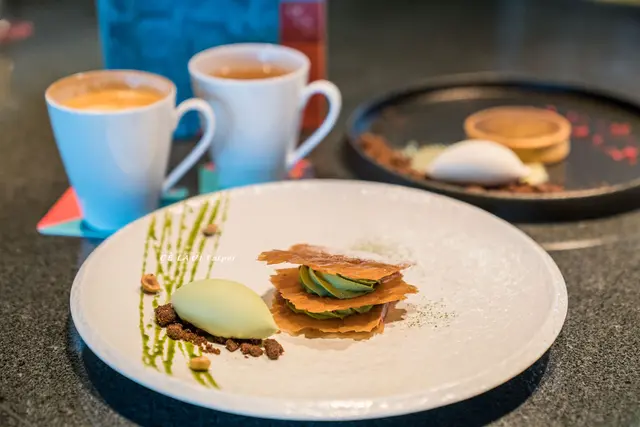 餐後的熱拿鐵搭配冰涼的台灣紅玉熔岩奶茶塔