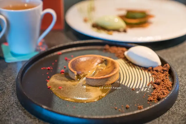 台灣紅玉熔岩奶茶塔左巧克力酥餅、百香果醬、香草冰淇淋