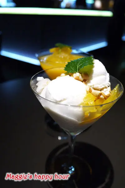 享用完美饌佳餚後,最後則是店家待別招待的二款冰品,「泰椰冰」裡面有二球椰奶冰淇淋,底部用了椰奶和芒果條,吃得到Q彈的口感,還有第一次吃到椰奶冰淇淋,香濃而不甜,我好喜歡。