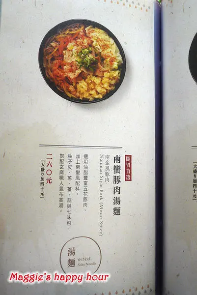 「南蠻豚肉蕎麥湯麵」是選用油脂豐富的豬五花加上柚子皮、蔥、薑、蒜等南蠻風的配料,在加入熬煮多時的玄麻職人昆布高湯,呈現出湯頭甘甜,配料豐富的一碗湯麵。