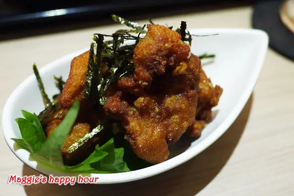 「炸雞塊」單點60元,看起來色澤很深,上面擺上不少的海苔絲,這樣一份炸雞塊有三塊雞肉,以價位來說有些偏高,我覺得大概來個五塊比較合理。