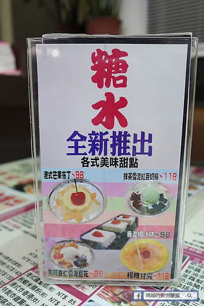 不過放在桌上的菜單也夠琳瑯滿目了,看是要吃粥、飯、麵、湯,還是港式燒臘、點心,也有三明治麵包類的主食,熱炒、煲仔菜類,當然不能錯過的還有甜點糖水類和港式飲品啦!