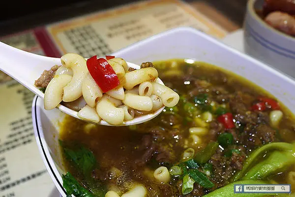 整碗牛肉通心麵裡,以牛肉丁搭配青江菜,在灑上蔥花和辣椒,加上濃淡適宜的咖哩香,還有沙嗲和花生的味道也在裡面。