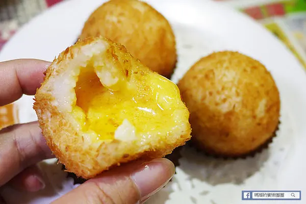 這一咬開來裡面的奶黃流沙爆炸開來,黃澄澄的內饀還留有溫度,還好我是放了一陣子才吃,不然這下子肯定會燙傷嘴巴,大家吃這道務必小心,不要一上桌就馬上拿起來吃喲!不過這貴妃流沙球的外層香脆,內層如麻糬般Q軟,而內饀不用說啦!香濃好滋味,吃完一顆還想再一顆啦!
