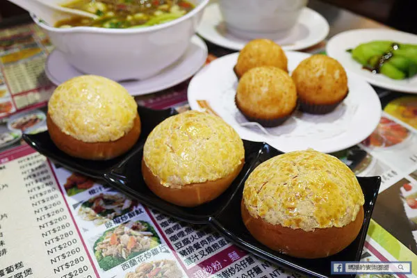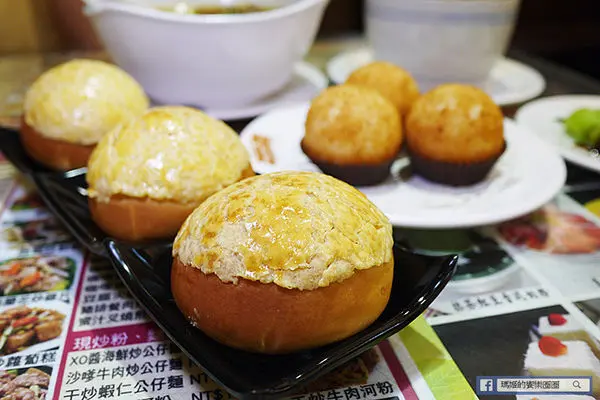 「叉燒菠蘿包」128元,這是一道中西合併的創意美食,以西式的菠蘿包,包進中式的叉燒內饀,外層烤的金黃色澤香氣誘人,三顆圓滾滾的外型尺寸還不小喲!