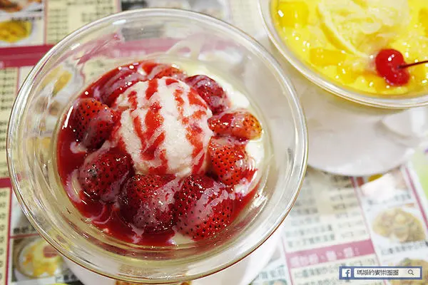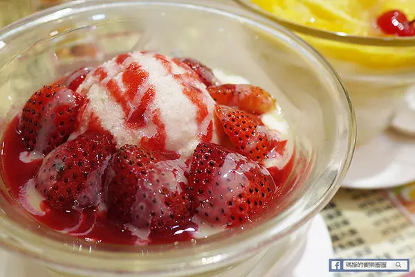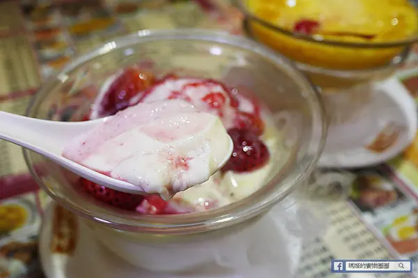 「草莓奶撈」118元,奶撈是用蛋白和牛奶做成的布丁,中間加了一球草莓雪泥,外圍再圍上一圈新鮮草莓,再淋上草莓醬和煉乳,即成一道可口的甜點。