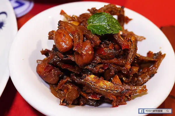 「參巴鳯尾魚乾」50元,以道地秘製醬料做成的馬來西亞風味小菜,裡面有尺寸頗大的小魚乾和花生,加上有辣椒入味,嚐起來微微的辣味十分開胃又不油膩,因為很入味,所以小魚乾沒有我害怕的腥味,在等待上菜的同時便一口接一口很涮嘴