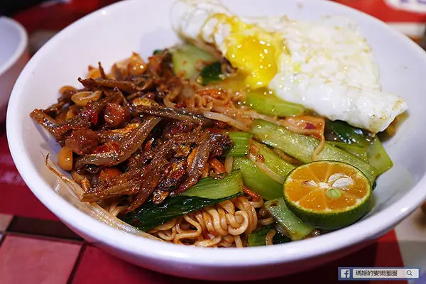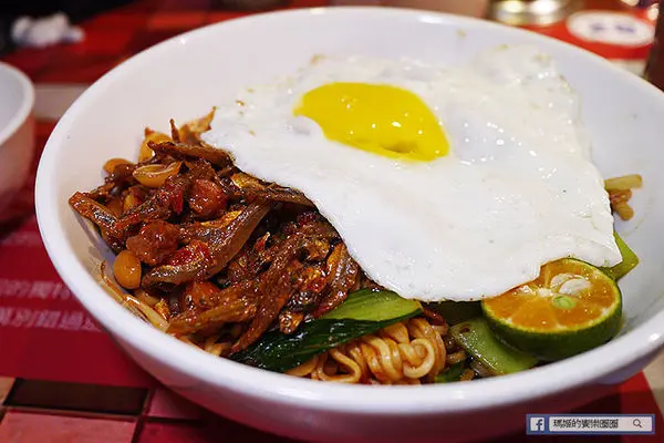 「美極炒麵」160元,底下是炒泡麵,上面舖上參巴鳯尾魚乾和青江菜,再放上一顆半熟太陽蛋