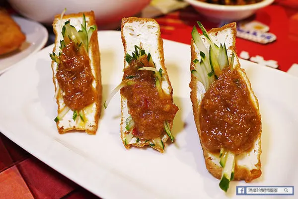 「馬來阿給」60元,光看外型很像台式的臭豆腐,把四四方方的豆腐酥炸後切成三角對半,再加了花生顆粒在裡面的特製沙嗲醬和小黃瓜絲
