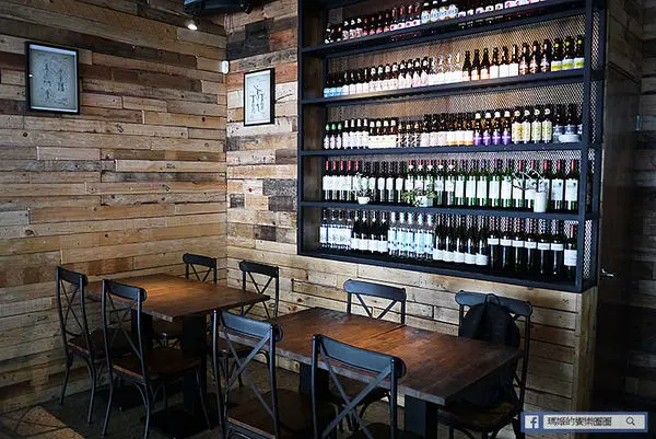 店裡濃濃的工業風,搭配和外觀一致的原木拼接,呈現不同區塊的色調,有種頹癈風格,我今天來的是中午時段,白天有日光進來,一樣有溫暖的感覺。而整面的酒牆擺放各式酒類,不難看出餐酒館的形態。(未成年請勿飲酒/請勿酒駕)