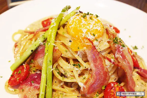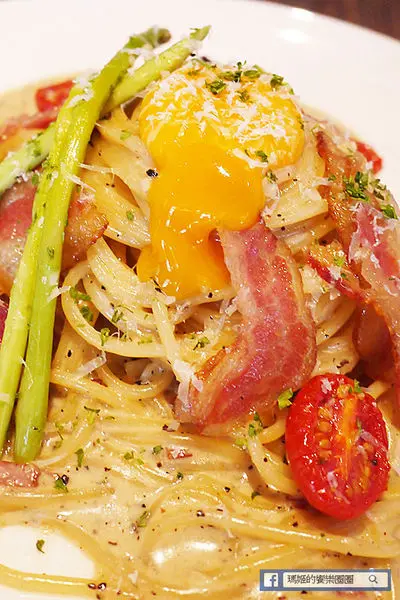 「奶油培根蛋黃麵」280元,以Garofalo銅模製細麵、煙燻黑毛豬手工培根、帕拿諾起司、石安牧場雞蛋為主要原料。