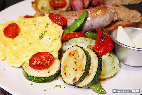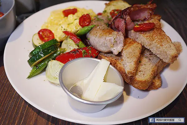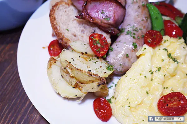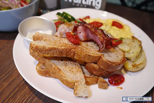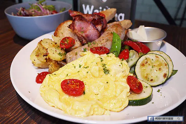 「Waiting大早餐」450元,看到「大」這個字我馬上聯想到一定很豐盛,這款大早餐的內容含有:全麥麵包、手工英式早餐腸、現煎培根、快炒時蔬、奶油煎馬鈴薯與酸奶、風乾蕃茄、沙拉、石安牧場蛋二顆,和新鮮季節果汁。