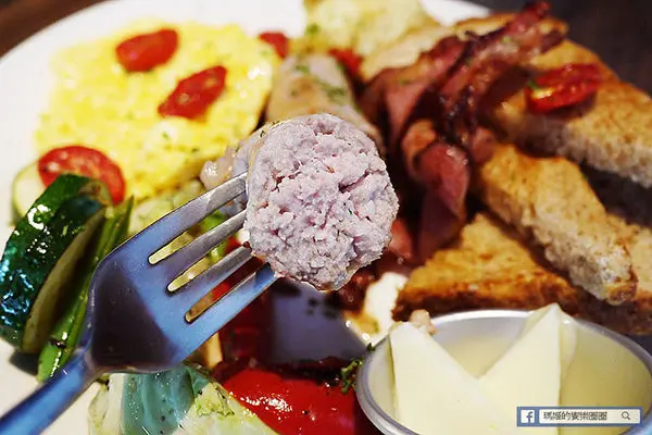 主菜培根和手工英式早餐腸,純手工製的英式早餐腸較為費工,它的皮很薄但很有彈性,灌入紮實的肉饀吃來帶著彈牙又脆口的感覺,味道不會過鹹,風味還不錯。