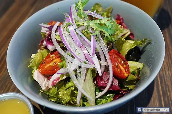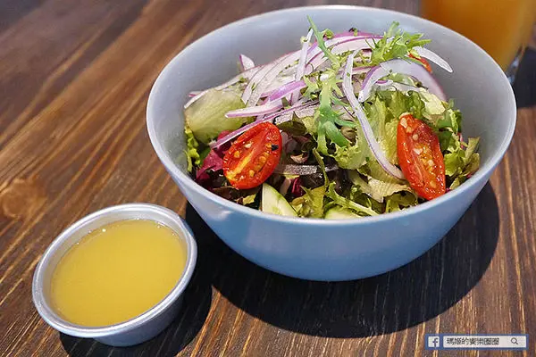 大早餐附的沙拉很大一份,裡面有多種的蔬菜水果,倒入特製的油醋醬,和一般深色的油醋醬不太一樣,不過吃起來味道卻也相去不遠,混入綜合沙拉一起吃,不會太過於乏味。