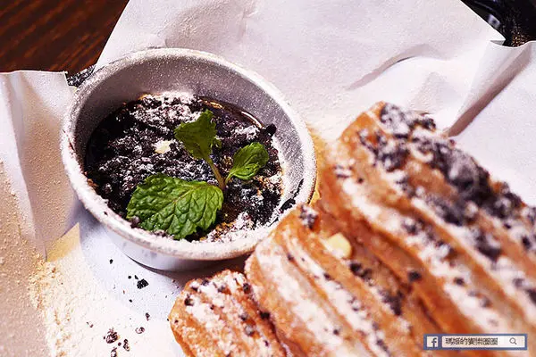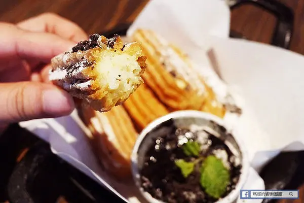吉拿棒上灑上糖霜和巧克力脆片,咬下後一股濃濃奶香味衝了上來,外層炸得好酥,但內層卻又保有微濕潤感,吃起來也不會太甜,我就邊聊天邊吃了好幾根,不想浪費美食又擔心身體難以回復,金害!