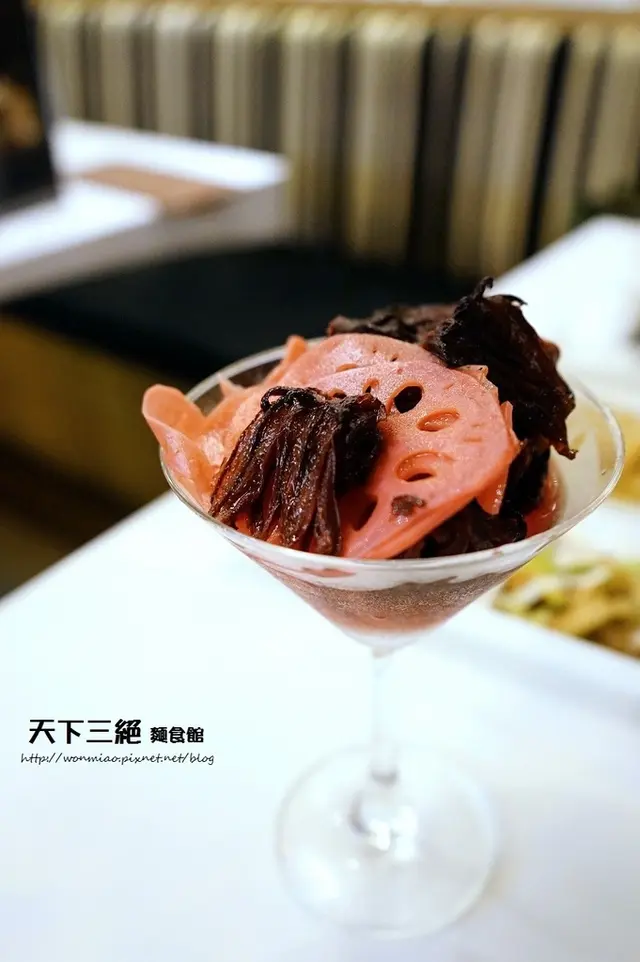 醃漬的洛神花與蓮藕作成的涼拌菜,以高腳杯盛裝,帶來不一樣的視覺感受,