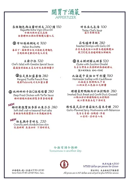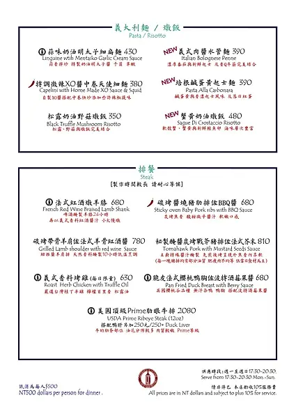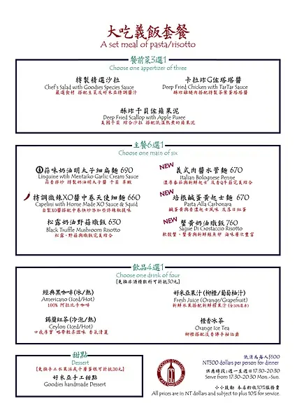 提供各式單點及套餐組合,餐點內容有開胃下酒菜、義大利麵/燉飯、排餐、