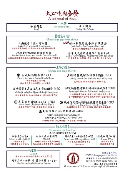 大吃義飯套餐、大口吃肉套餐、飲料、甜點、酒品等,詳細菜單請參考→官方menu