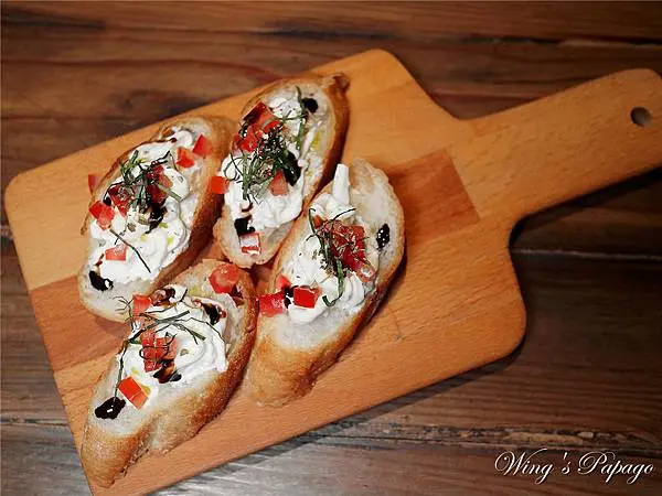 切片長棍麵包搭配起司、番茄丁、蘿勒葉,佐巴沙米可醋及橄欖油。